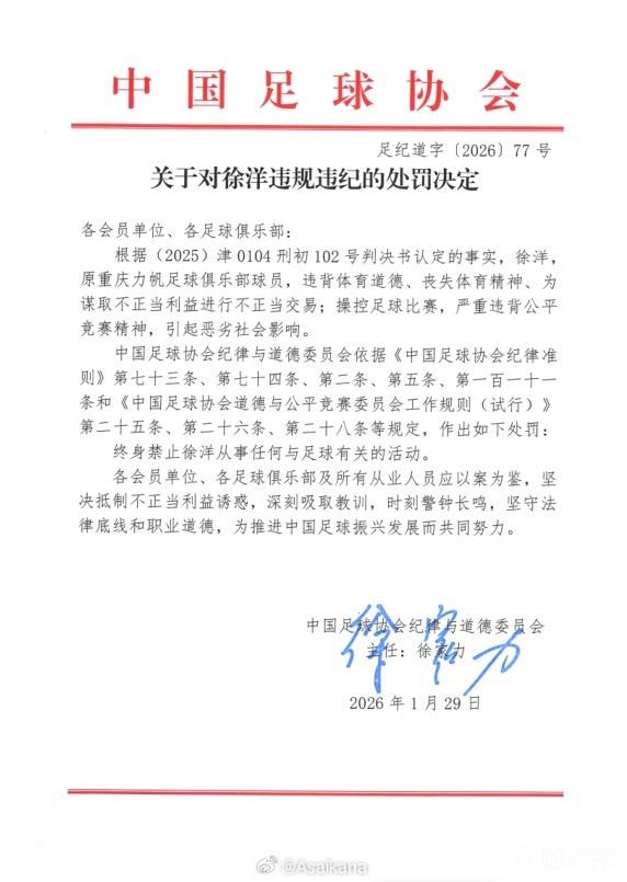 北京时间1月29日,公安部、国家体育总局、中国足协在北京联合召开假赌黑问题专项整治行动新闻发布会。之后中国足协官方公布了73人的终身禁足名单,其中球员徐洋第二次被处罚。