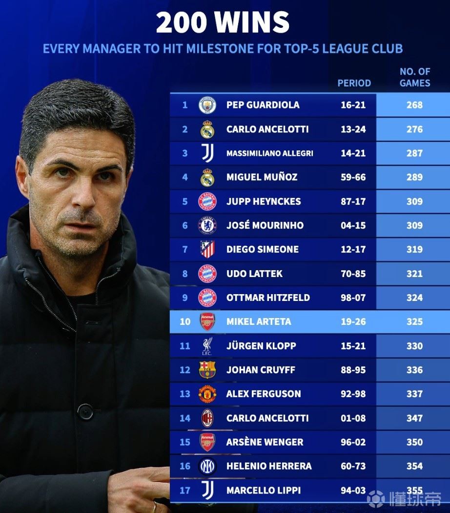 五大联赛俱乐部最快200胜主帅:瓜帅第1,阿尔特塔325场第10