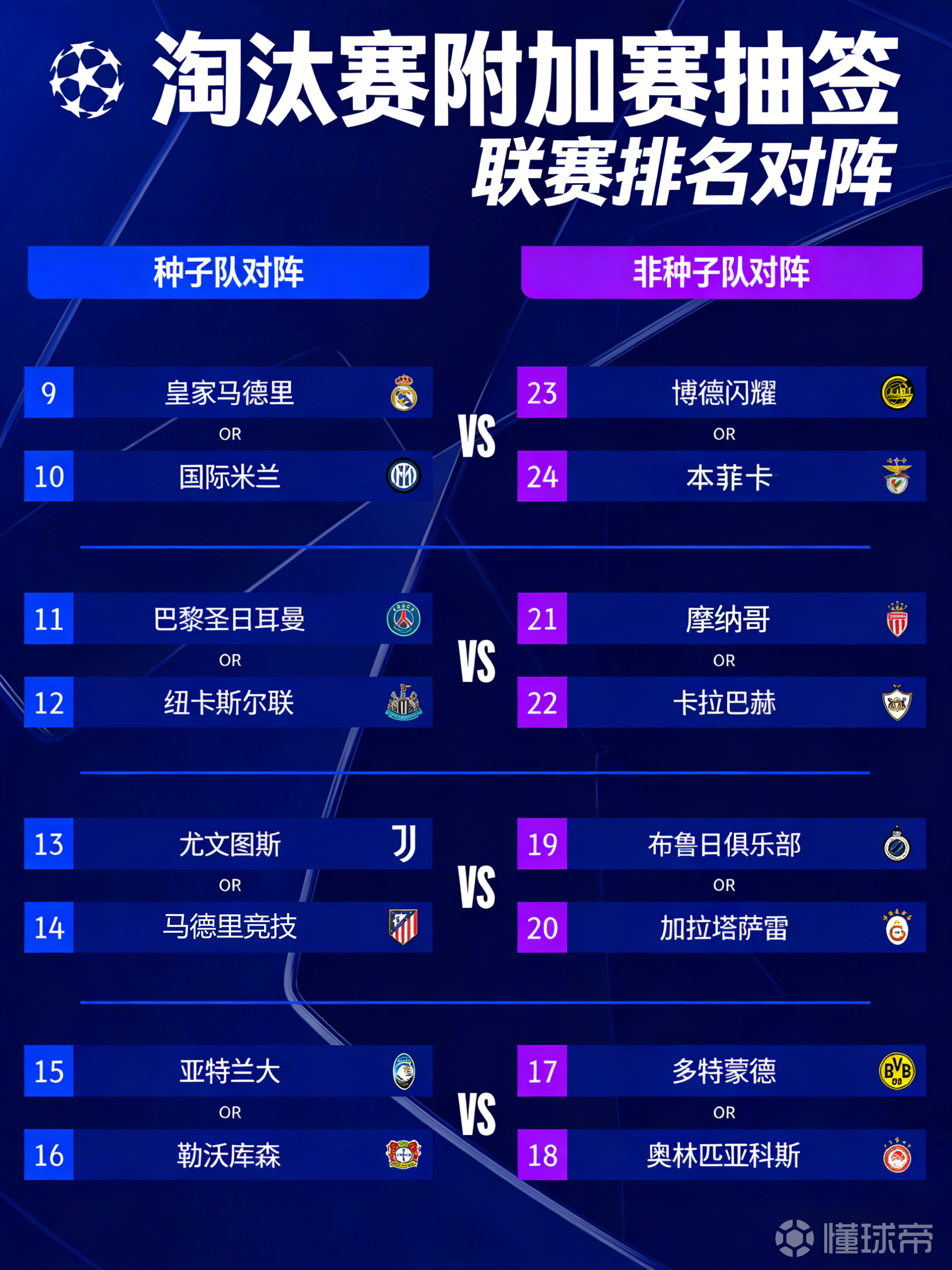 欧冠淘汰赛抽签规则及完整赛程公布欧足联正式公布欧冠淘汰赛附加赛抽签规则,同时确定了淘汰赛阶段的全部赛程节点,各阶段时间与对阵抽签原则均已明确。✅ 淘汰赛附加赛抽签原则依据联赛阶段最终排名配对,9-16 名组成 4 个种子队组合,17-24 名组成 4 个非种子队组合;种子队组合与对应非种子队组合交锋,具体对阵为:9/10 名 VS23/24 名、11/12 名 VS21/22 名、13/14 名 VS19/20 名、15/16 名 VS17/18 名。✅ 淘汰赛附加赛赛程采用两回合制,种子队原则上次回合坐镇主场,各队原则上周二、周三各进行一场比赛;首回合:2026 年 2 月 17/18 日次回合:2026 年 2 月 24/25 日若遇球场 / 城市赛程冲突,将按欧足联俱乐部赛事委员会相关原则处理,抽签后公布具体开球时间。✅ 晋级与后续抽签安排附加赛胜出的 8 支球队晋级 16 强;16 强、四分之一决赛、半决赛的抽签仪式,将于 2026 年 2 月 27 日(周五)进行。✅ 欧冠淘汰赛完整赛程16 强:2026 年 3 月 10/11 日、3 月 17/18 日四分之一决赛:2026 年 4 月 7/8 日、4 月 14/15 日半决赛:2026 年 4 月 28/29 日、5 月 5/6 日决赛:2026 年 5 月 30 日(布达佩斯)关注“TGsports2015”跟随铁杆一起奔赴布达佩斯圆梦欧冠决赛,见证荣耀时刻!
