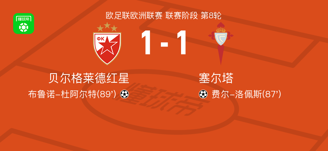 北京时间1月30日欧足联欧洲联赛 联赛阶段 第8轮,贝尔格莱德红星对阵塞尔塔。贝尔格莱德红星布鲁诺-杜阿尔特破门。塞尔塔费尔-洛佩斯破门。最终比分贝尔格莱德红星 1-1 塞尔塔。