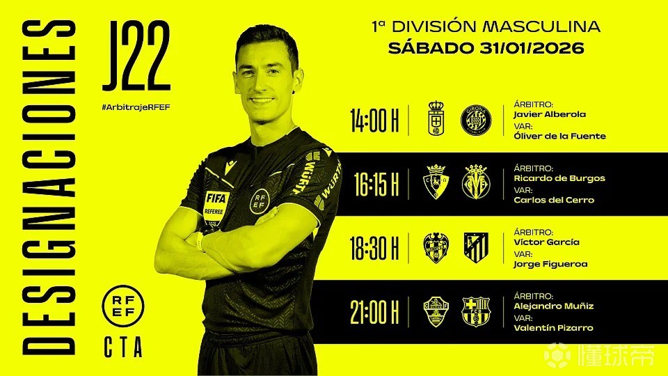 西班牙足协官方公布了周六4场西甲比赛的裁判安排,亚历杭德罗-穆尼斯将执法巴萨客战埃尔切。