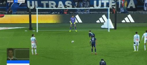 第90+4分钟,补时阶段鲁利送点,凯巴尔主罚命中,巴黎FC2-2马赛