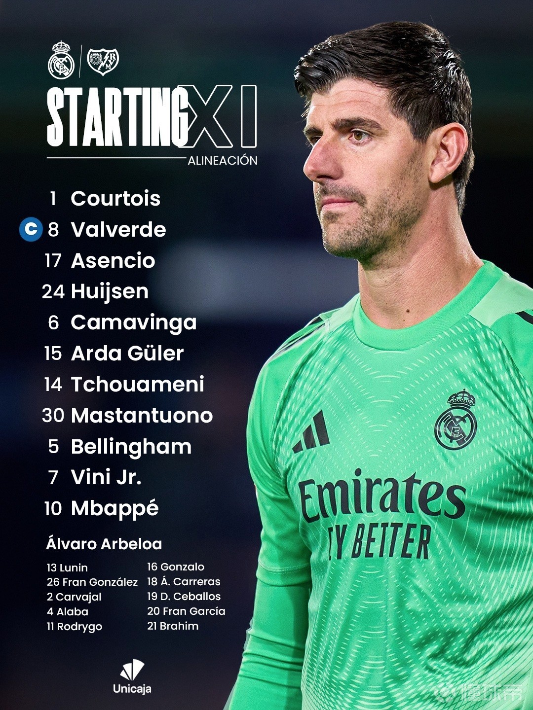 皇家马德里首发:1-库尔图瓦、8-巴尔韦德、17-劳尔-阿森西奥、24-赫伊森、6-卡马文加、15-居莱尔、14-楚阿梅尼、30-马斯坦托诺、5-贝林厄姆、7-维尼修斯、10-姆巴佩
