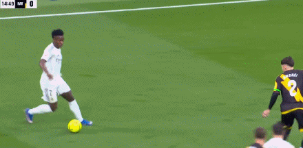 西甲第22轮,皇马主场迎战巴列卡诺,第16分钟,维尼修斯1v3扣球虚晃+写意兜射破门,皇马1-0巴列卡诺!