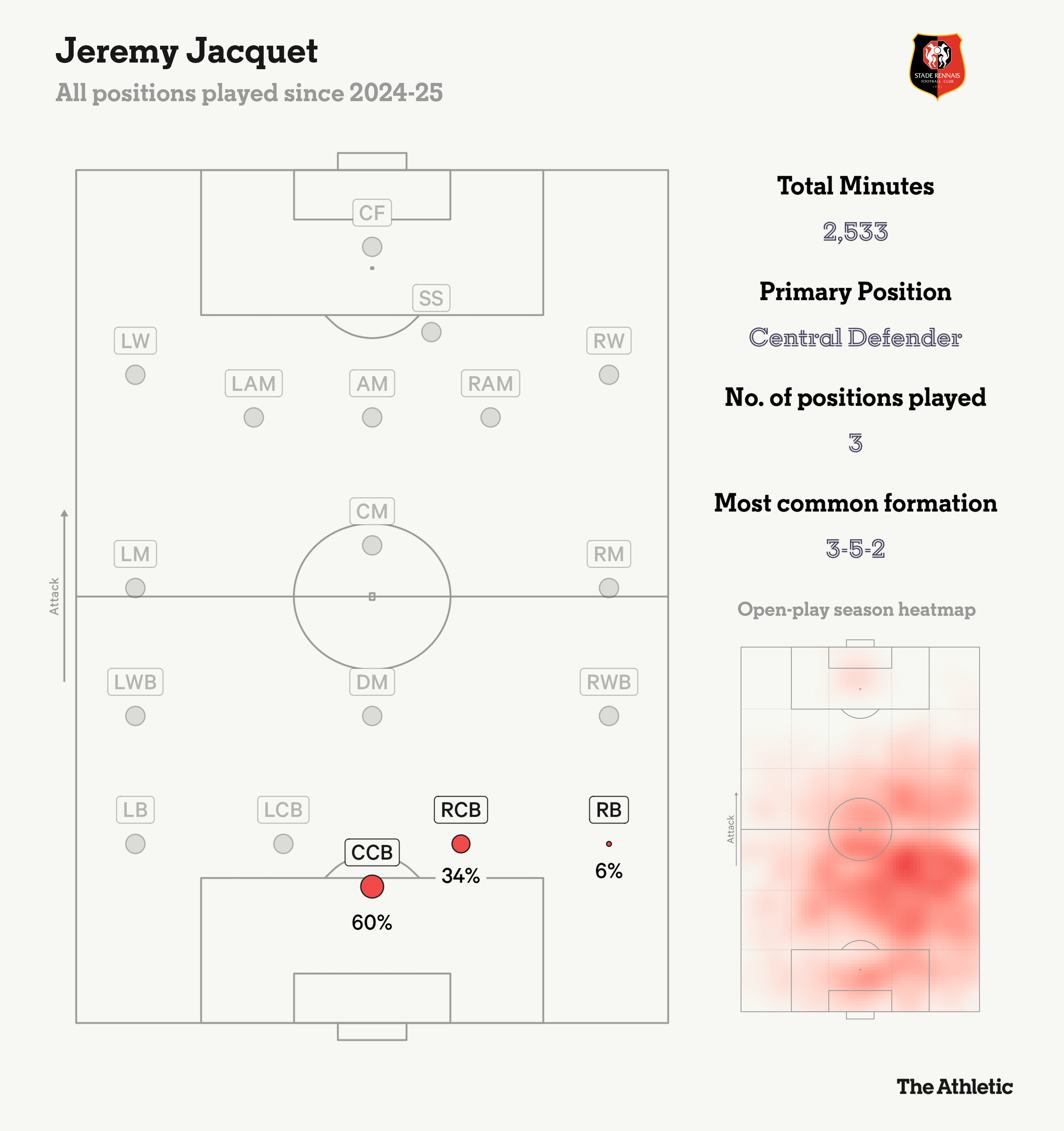 这名后卫的身材与今夏加盟的乔瓦尼-莱奥尼相似,实际上已经有着191cm的海拔,因此很难被忽视。雷恩在主教练哈比卜-贝耶的带领下主要采用3-5-2阵型。雅凯最初担任右中卫,但现在已经转型为三后卫体系中的居中后卫。