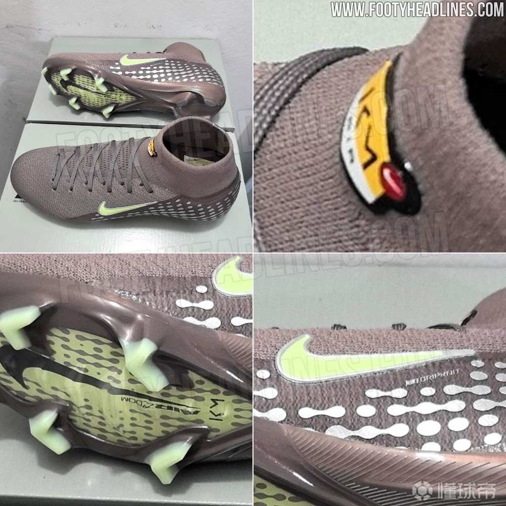 细节方面,鞋面布满银色“胶囊状”图形纹理,从后跟向两侧延展,不仅增强了层次感,也让整双球鞋在灯光下更具辨识度。姆巴佩个人标志同样十分突出:鞋舌区域印有专属“KM”标识,后跟位置则加入“ZmAir”字样与纵向Mercurial字母标识,进一步强化签名属性。外底与鞋钉采用荧光绿色设计,与鞋面元素形成呼应。