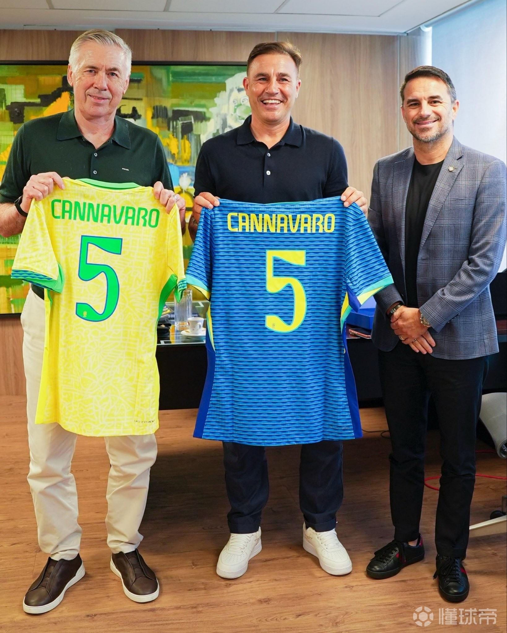 卡纳瓦罗造访巴西足协并与安切洛蒂合影,他正在巴西推广香水