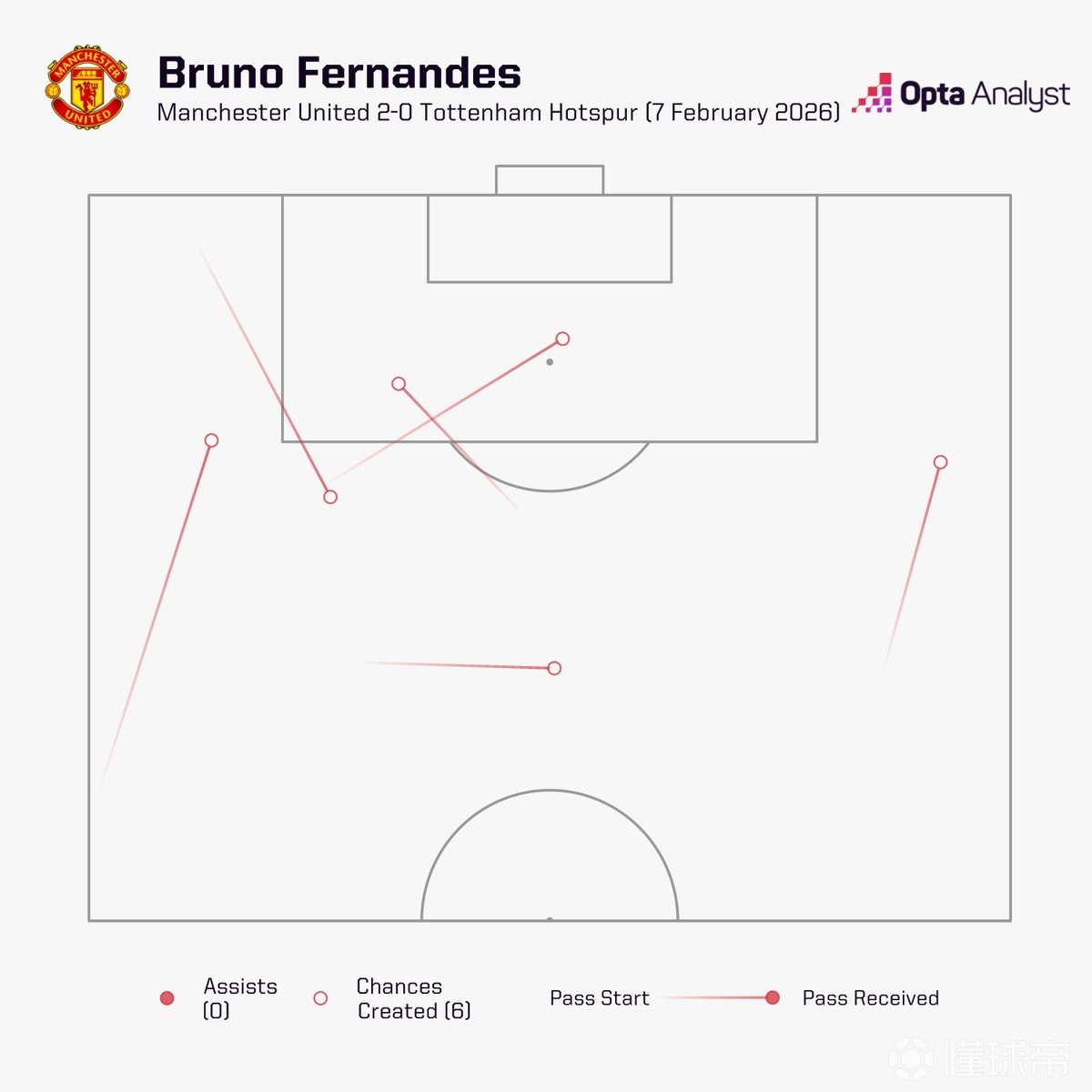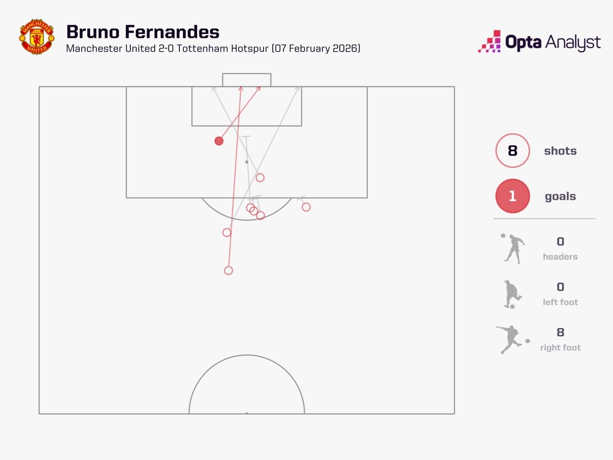 此役主场对阵热刺,布鲁诺-费尔南德斯完成了8次射门,打入1球,此外还创造了6次机会,一共参与了14次射门。