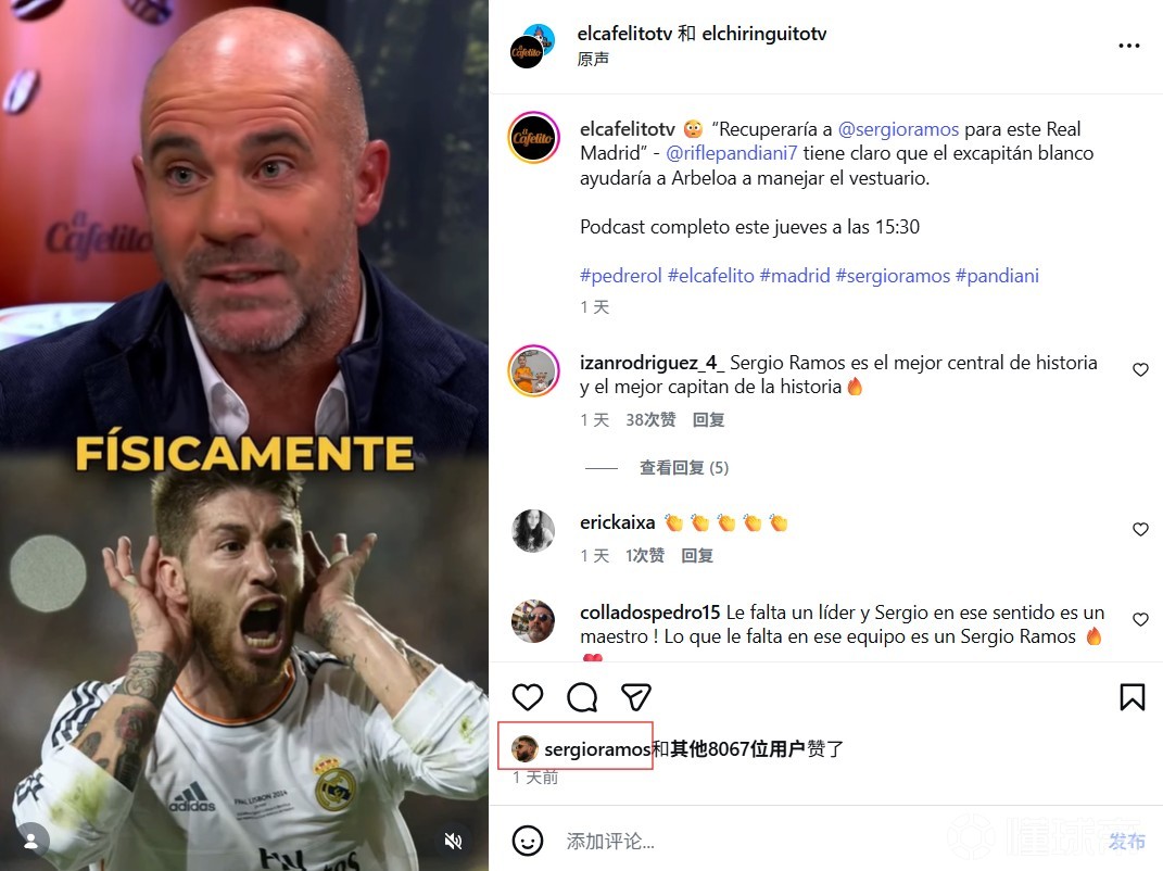 前西甲球星表示皇马应召回拉莫斯,拉莫斯点赞了这条帖子