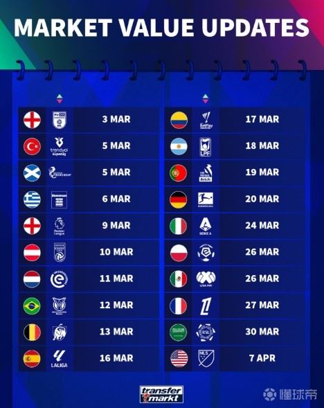 北京时间2月28日凌晨,德国转会市场公布了各联赛球员最新一期身价的更新时间,其中英超将在3月9日公布,西甲在3月16日公布,德甲在3月20日公布,意甲在3月24日公布,法甲在3月27日公布。