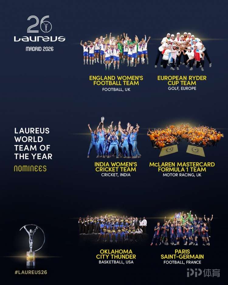 2026年劳伦斯年度最佳团队奖候选名单出炉,英格兰女足、巴黎圣日耳曼在列。