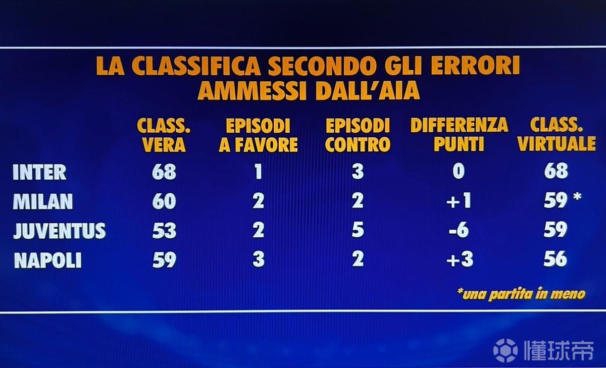 本赛季意甲误判影响:尤文5次遭遇误判少拿6分,国米积分不变
