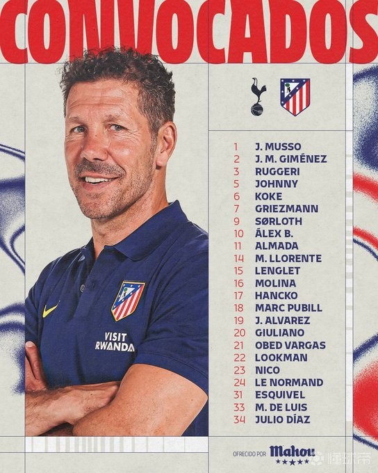 马竞客战热刺大名单:小蜘蛛领衔,门多萨、巴里奥斯缺席